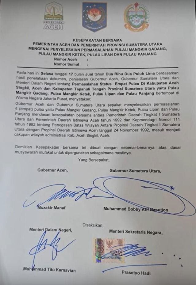 Kesepakatan ini merupakan hasil dari kajian mendalam dokumen, penjelasan historis, dan konsultasi bersama Menteri Dalam Negeri Muhammad Tito Karnavian serta Menteri Sekretaris Negara Prasetyo Hadi. Dalam naskah resmi, kedua gubernur menyatakan sepakat bahwa keempat pulau tersebut—yang berada di antara Kabupaten Aceh Singkil dan Kabupaten Tapanuli Tengah—secara administratif resmi menjadi bagian dari wilayah Provinsi Aceh.