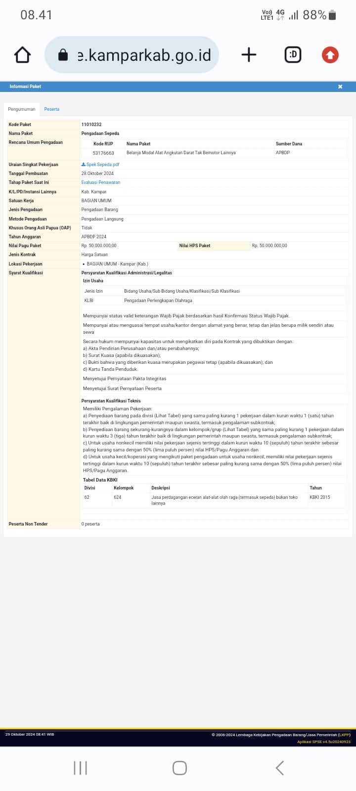 Ditempat terpisah redaksi mencoba konfirmasi kepala Bagian umum sekretariat kantor bupati Kampar Yogi Yudistira, Terkait munculnya Pengadaan sepeda dilaman Lembaga kebijakan pengadaan barang/jasa pemerintah (LKPP) Kampar, APBD P Tahun Anggaran 2024 Pemerintah daerah kabupaten Kampar menganggarkan Pengadaan sepeda senilai Rp.50.000.000, (Lima Puluh juta rupiah )