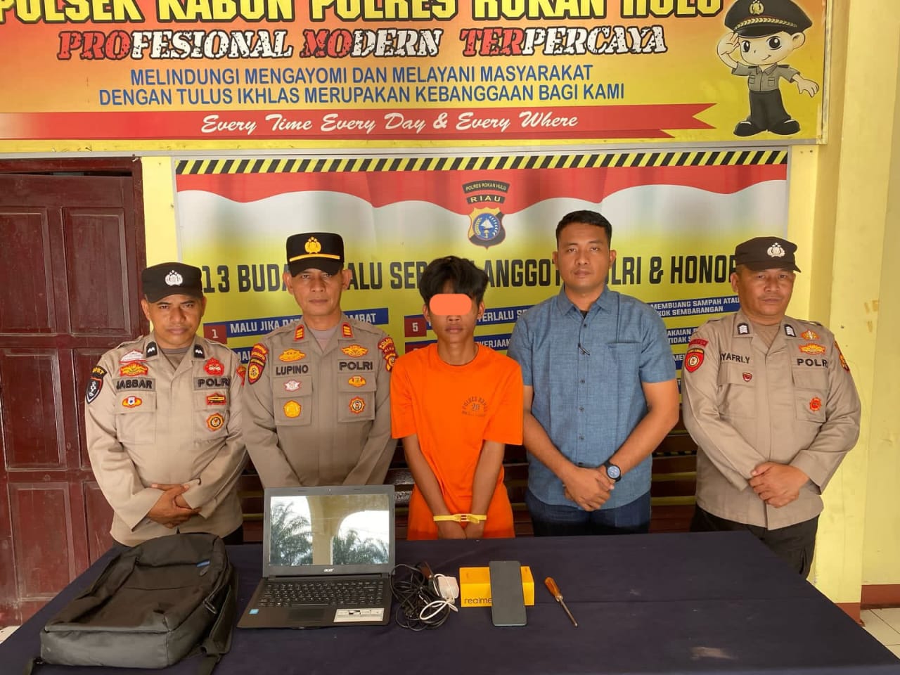 Saat penangkapan, tim Reskrim menemukan barang bukti berupa satu tas hitam berisi satu unit laptop merk Acer dan satu unit handphone Realme warna biru. Pelaku langsung diamankan dan dibawa ke Mapolsek Kabun guna pemeriksaan lebih lanjut.