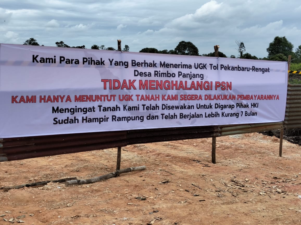 Dari spanduk yang dibentangkan masyarakat,Bertuliskan Kami Para Pihak yang Berhak Menerima UGK Tol Pekanbaru-Rengat Desa Rimbo Panjang TIDAK MENGHALANGI Proyek Strategis Nasional (PSN) KAMI HANYA MENUNTUT UGK TANAH KAMI SEGERA DILAKUKAN PEMBAYARANNYA,
