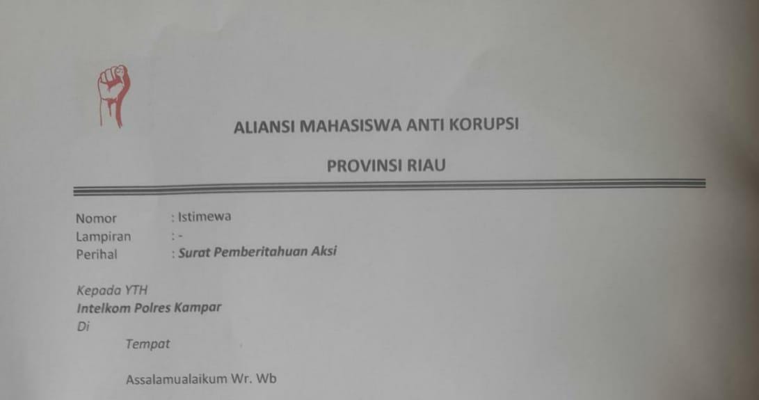 kampar____Aliansi Mahasiswa Anti Korupsi propinsi riau beredarnya surat layangkan surat aksi kepolres Kampar dugaan Korupsi Kades Tanjung Alai Kecamatan XIII koto kampar,