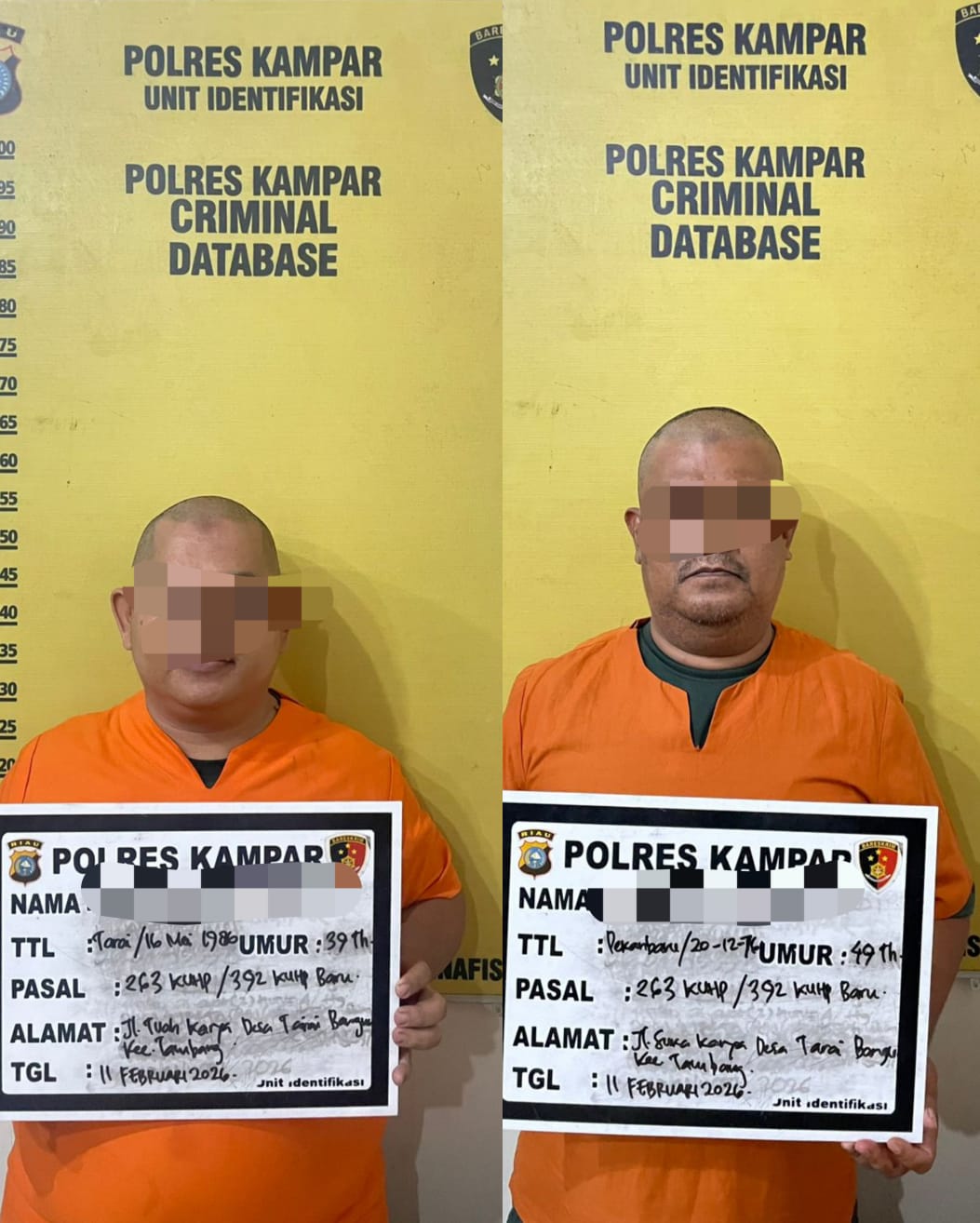 Bangkinang ____ Satreskrim Polres Kampar amankan terduga dua pelaku pemalsuan surat tanah, yaitu Kepala Desa Tarai Bangun AN (36) dan Mantan Sekretaris Desa Tarai Bangun EK (49) yang kini menjabat sebagai staf Kantor Camat Tambang, pada Rabu (11/2/2026).