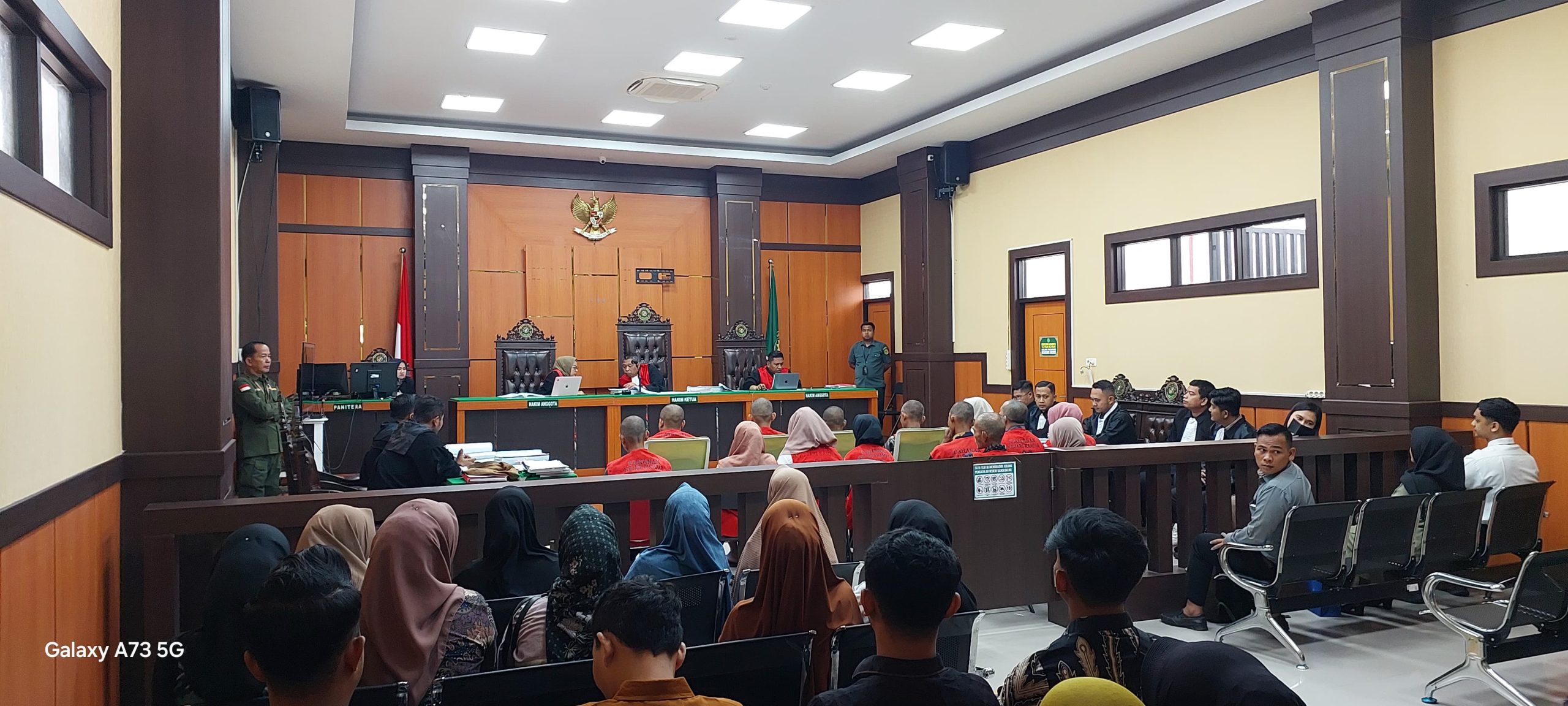 Sebanyak 14 terdakwa, yang terdiri dari Ketua Kelompok Penyelenggara Pemungutan Suara (KPPS), anggota KPPS, serta saksi dari masing-masing pasangan calon (paslon), tampak duduk di kursi pesakitan didampingi kuasa hukum mereka.